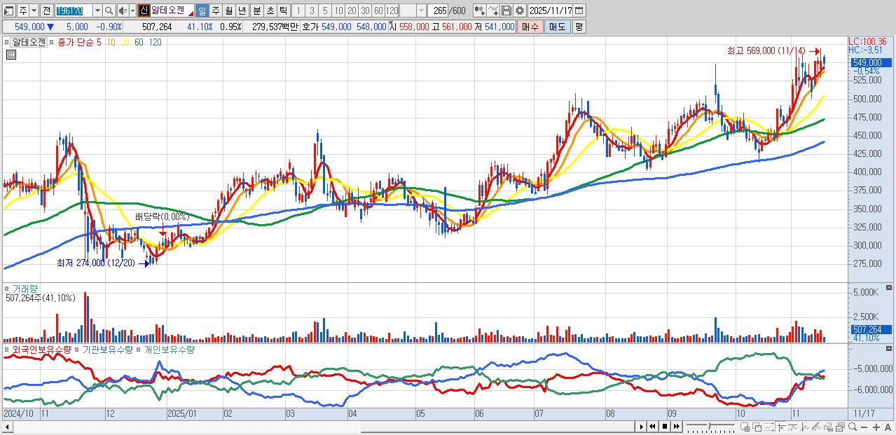 - 알테오젠 (548,000원 ▼ -1.08% , 시총: 293,212억, 거래량: 283,747, 거래대금:1,562억)
