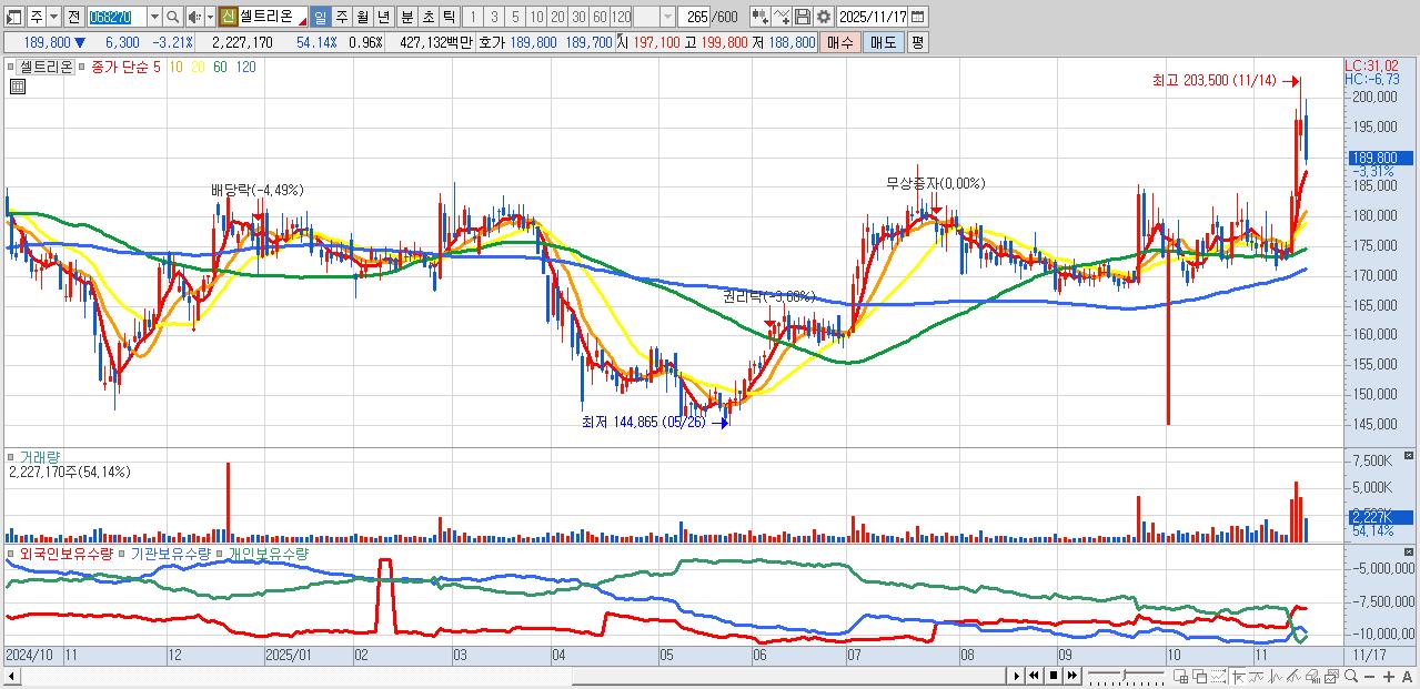 - 셀트리온 (189,900원 ▼ -3.16% , 시총: 438,595억, 거래량: 1,219,444, 거래대금:2,329억)