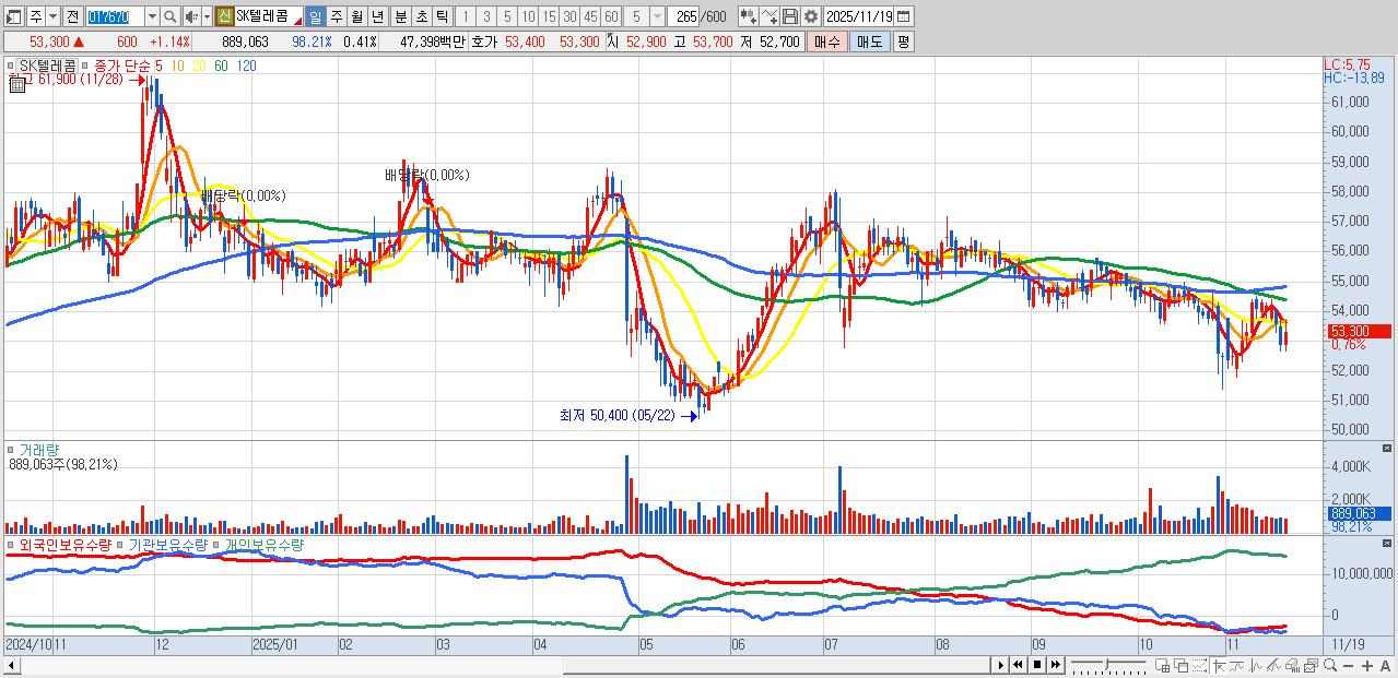 - SK텔레콤 (53,400원 ▲ 1.33% , 시총: 114,698억, 외국인 순매수 거래금:113억)