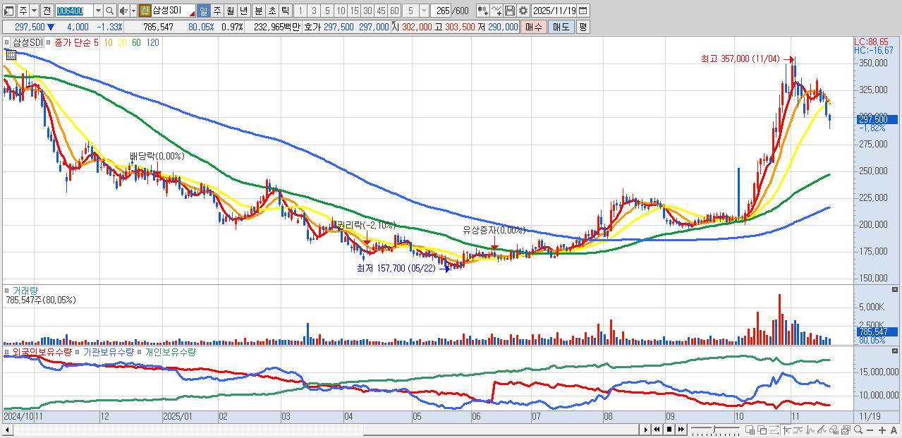- 삼성SDI (296,500원 ▼ -1.66% , 시총: 238,936억, 외국인 순매수 거래금:147억)