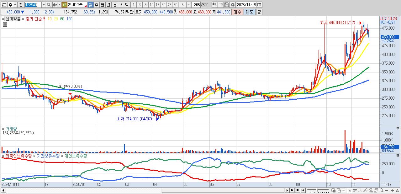 - 한미약품 (450,000원 ▼ -2.39% , 시총: 57,649억, 외국인 순매수 거래금:83억)