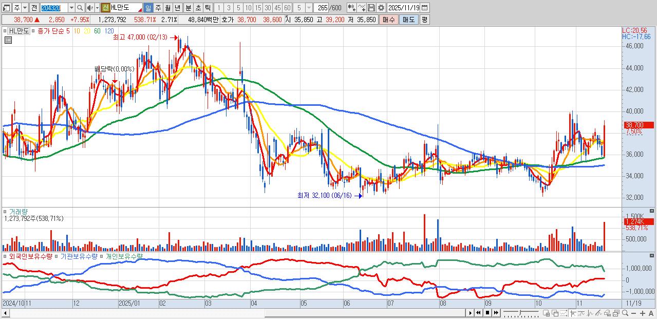 - HL만도 (38,900원 ▲ 8.51% , 시총: 18,266억, 외국인 순매수 거래금:114억)