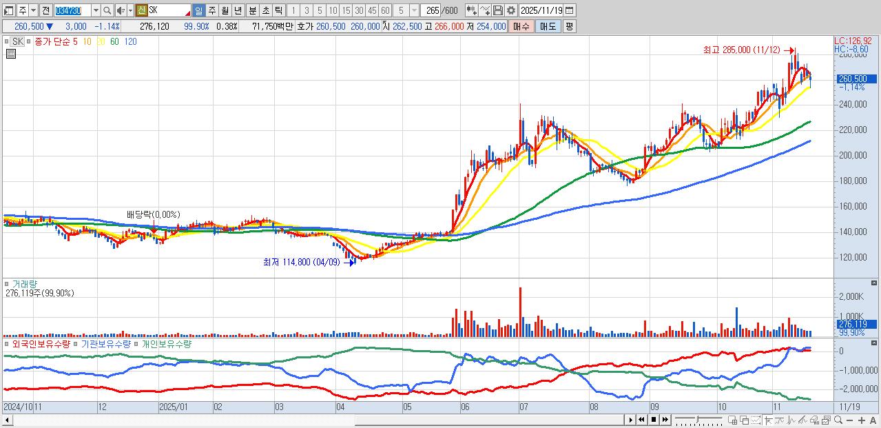 - SK (260,000원 ▼ -1.33% , 시총: 188,507억, 외국인 순매수 거래금:80억)