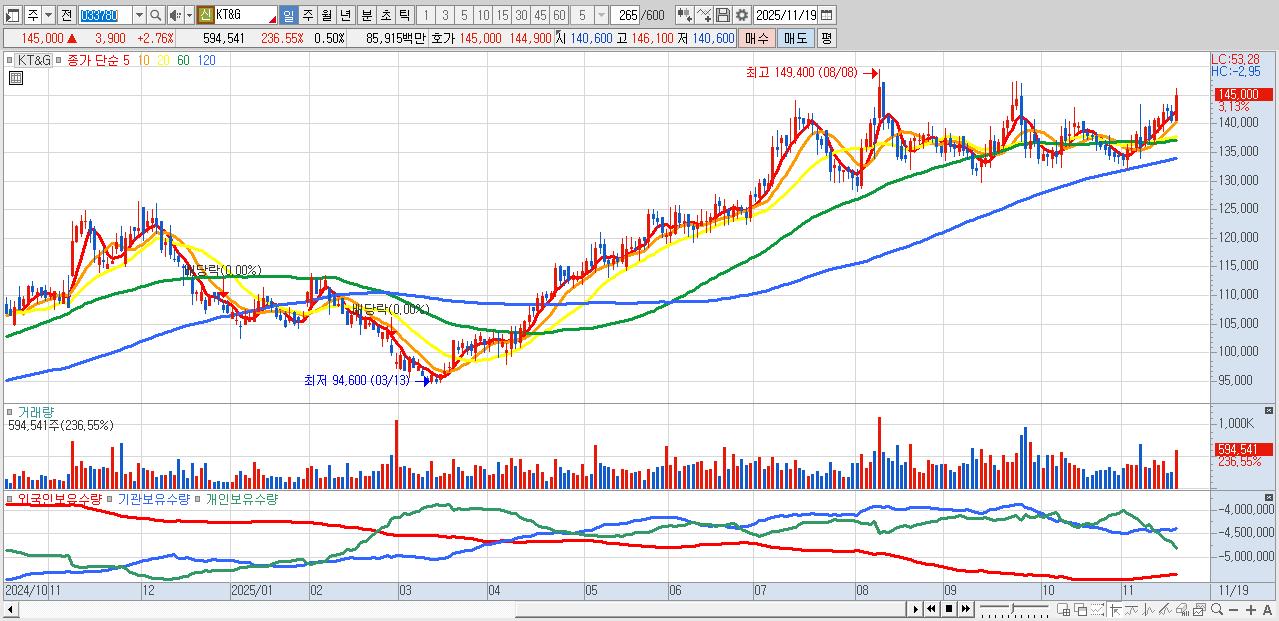 - KT&G (144,800원 ▲ 2.62% , 시총: 170,830억, 외국인 순매수 거래금:121억)
