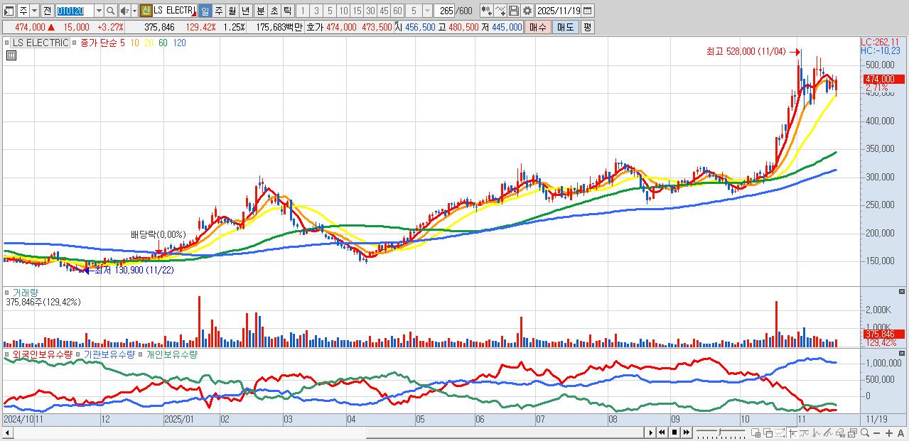 - LS ELECTRIC (475,000원 ▲ 3.49% , 시총: 142,500억, 외국인 순매수 거래금:176억)