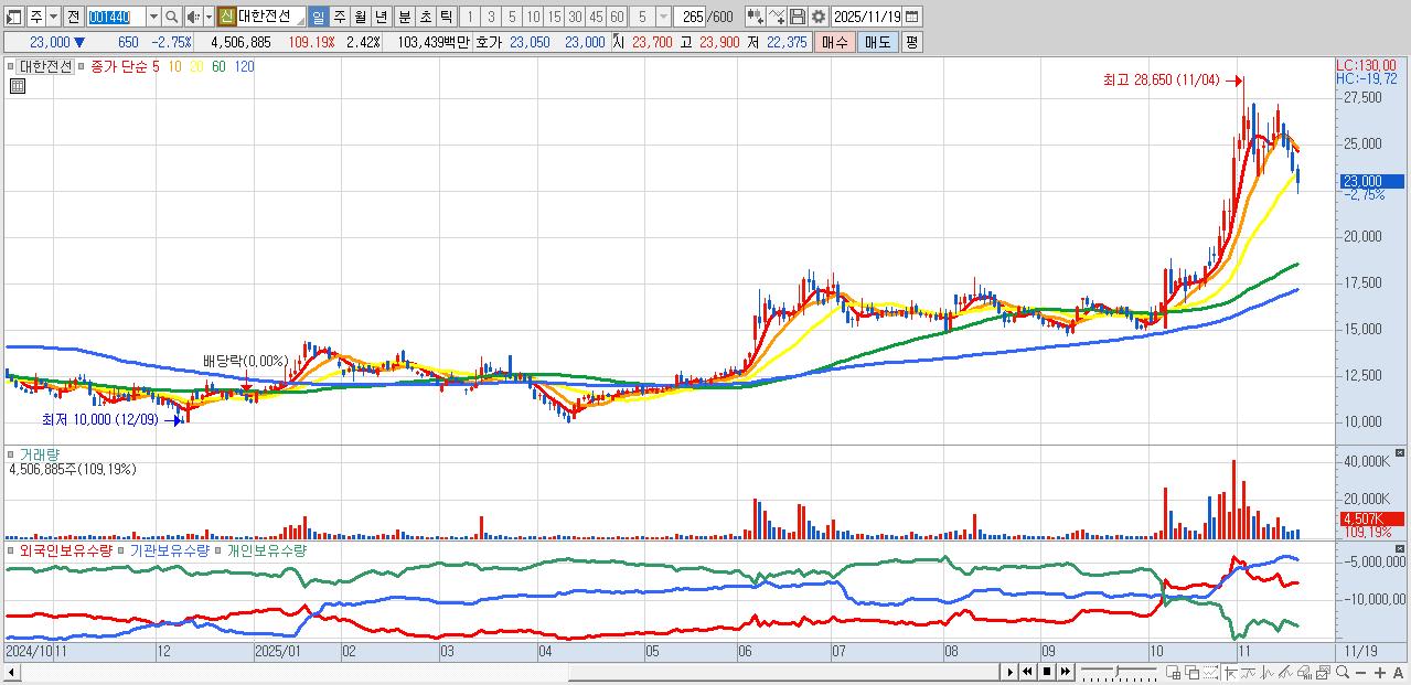 - 대한전선 (23,000원 ▼ -2.75% , 시총: 42,883억, 외국인 순매수 거래금:77억)