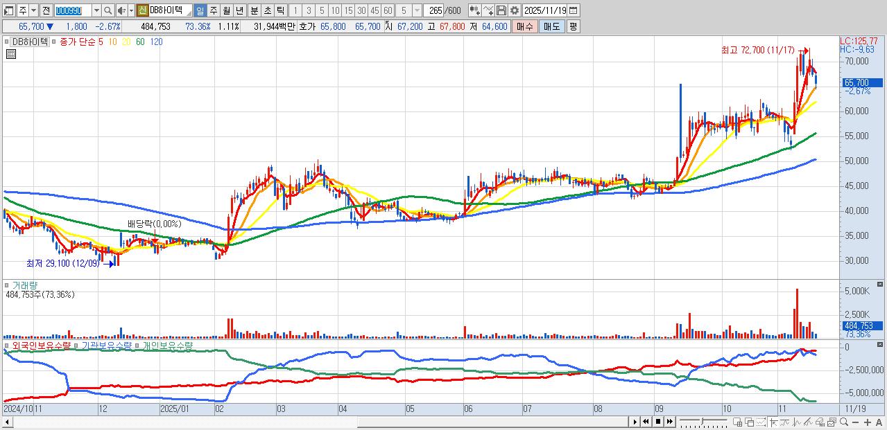 - DB하이텍 (65,700원 ▼ -2.67% , 시총: 28,583억, 외국인 순매수 거래금:53억)