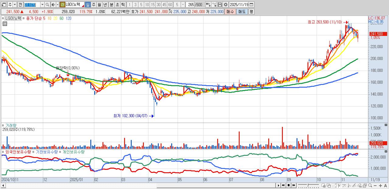 - LG이노텍 (240,500원 ▲ 1.48% , 시총: 56,919억, 외국인 순매수 거래금:70억)