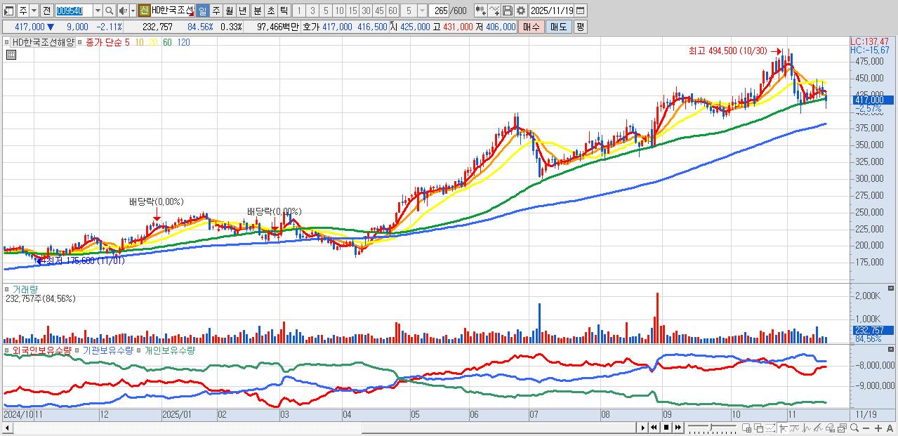 - HD한국조선해양 (418,000원 ▼ -1.88% , 시총: 295,832억, 외국인 순매수 거래금:106억)