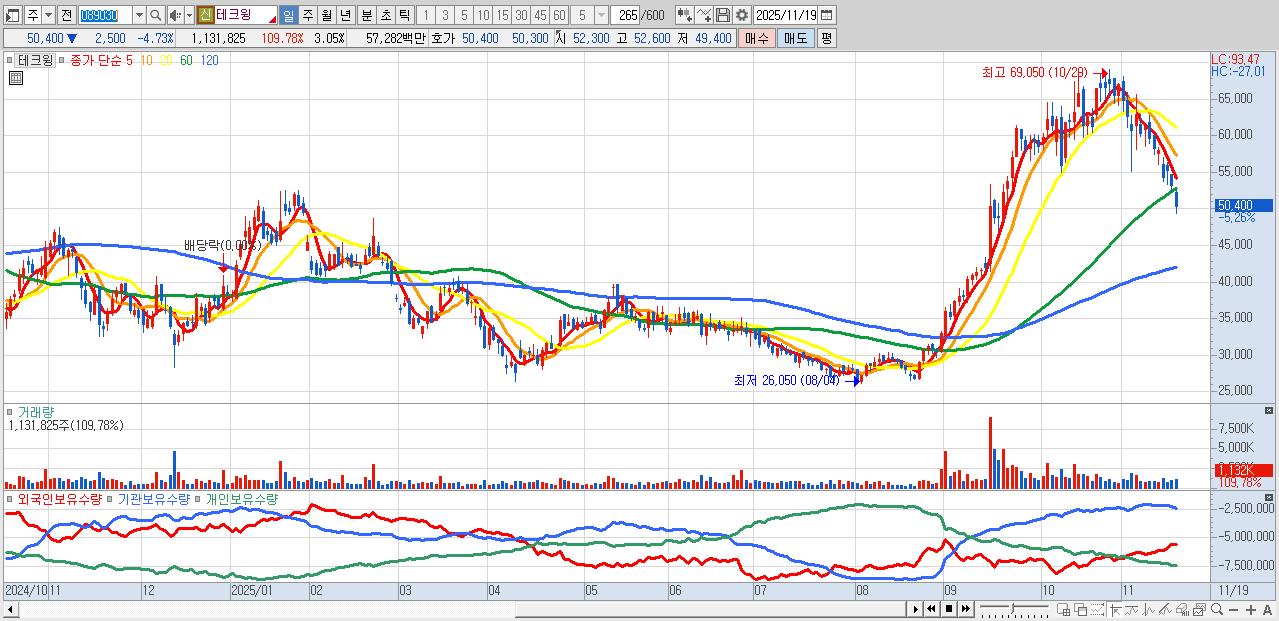 - 테크윙 (50,200원 ▼ -5.1% , 시총: 18,601억, 외국인 순매수 거래금:94억)