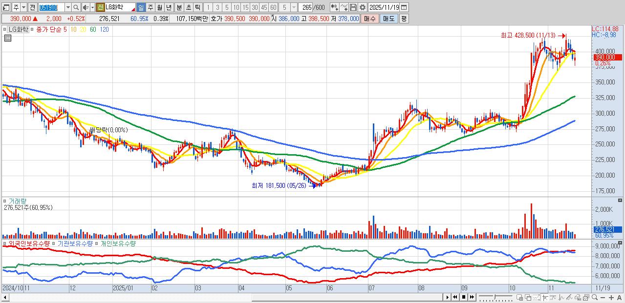 - LG화학 (390,500원 ▲ 0.64% , 시총: 275,663억, 외국인 순매수 거래금:81억)