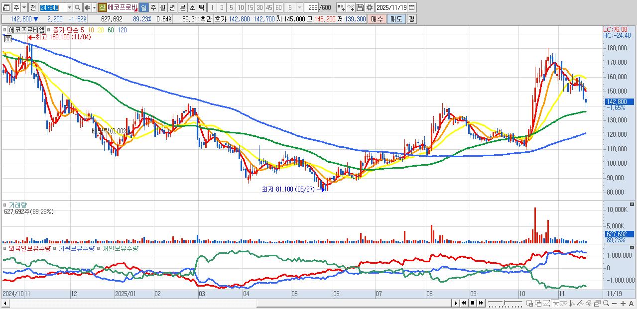 - 에코프로비엠 (143,500원 ▼ -1.03% , 시총: 140,345억, 외국인 순매수 거래금:75억)