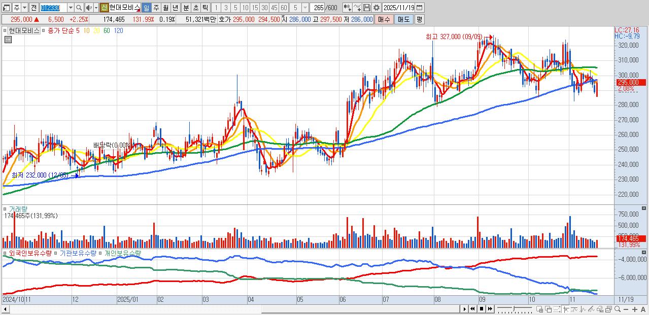 - 현대모비스 (295,500원 ▲ 2.43% , 시총: 268,115억, 외국인 순매수 거래금:124억)