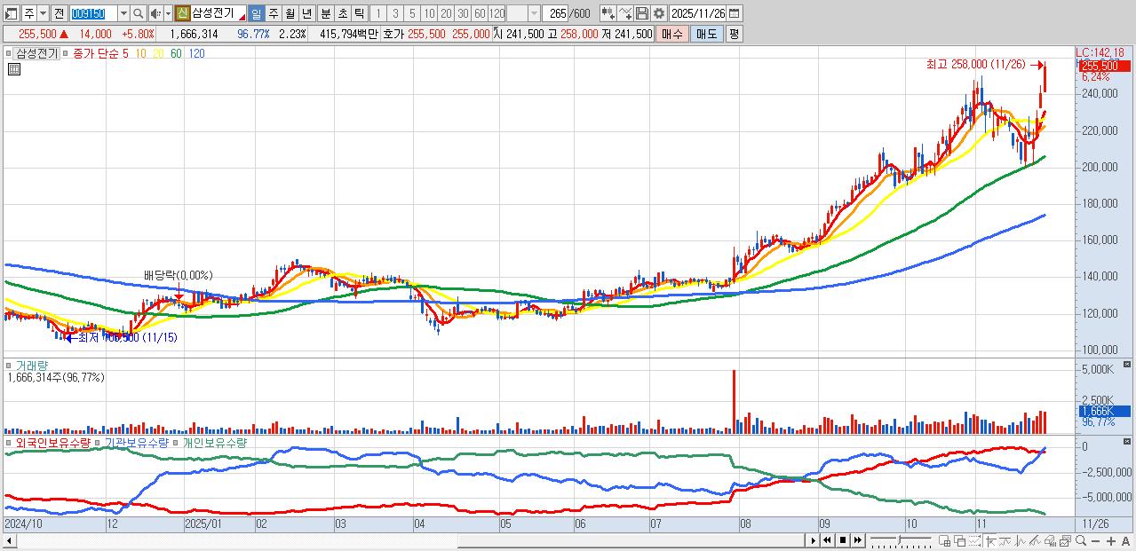 - 삼성전기 (257,000원 ▲ 6.42% , 시총: 191,963억, 거래량: 893,102, 거래대금:2,228억)