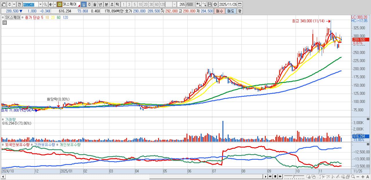 - SK스퀘어 (291,000원 ▲ 0.17% , 시총: 385,694억, 거래량: 536,219, 거래대금:1,556억)