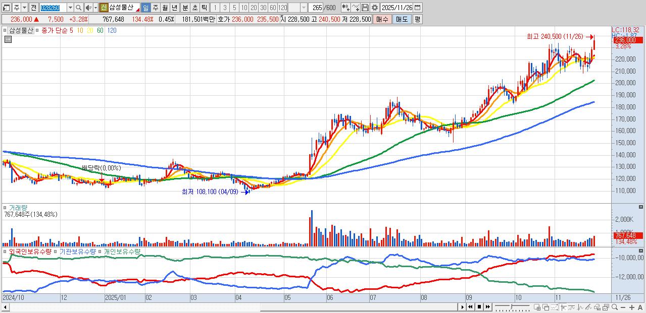 - 삼성물산 (236,000원 ▲ 3.28% , 시총: 401,145억, 거래량: 616,934, 거래대금:1,459억)