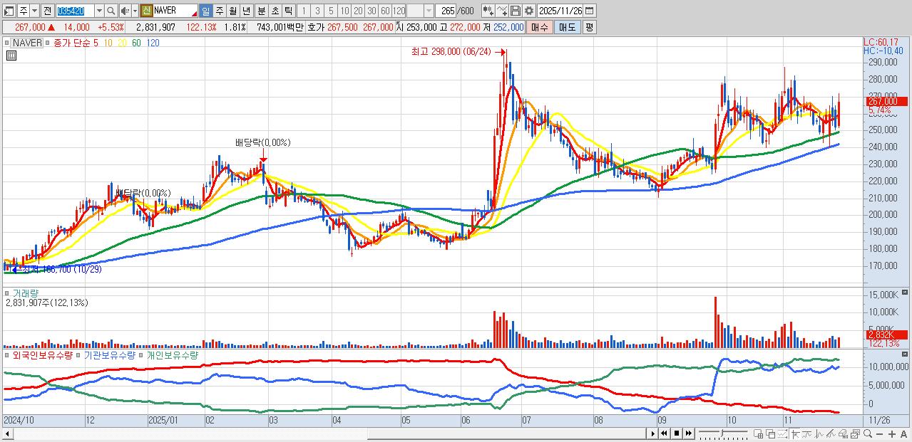 - NAVER (263,500원 ▲ 4.15% , 시총: 413,307억, 거래량: 944,519, 거래대금:2,444억)