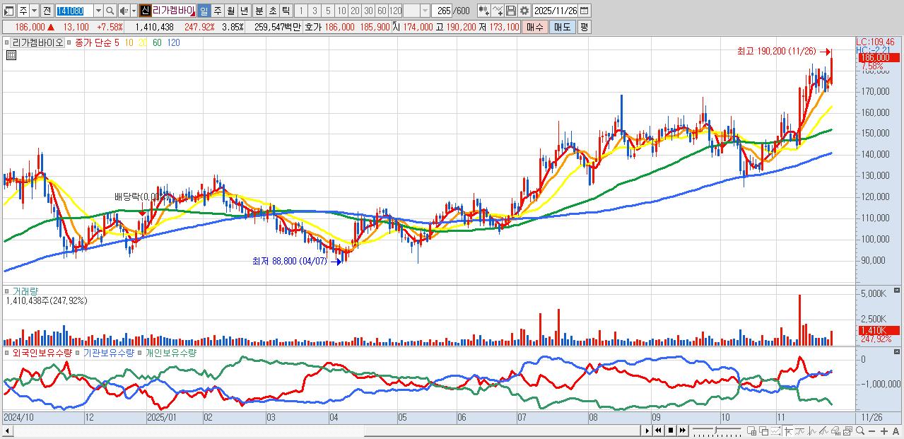 - 리가켐바이오 (185,600원 ▲ 7.35% , 시총: 67,949억, 거래량: 862,142, 거래대금:1,590억)
