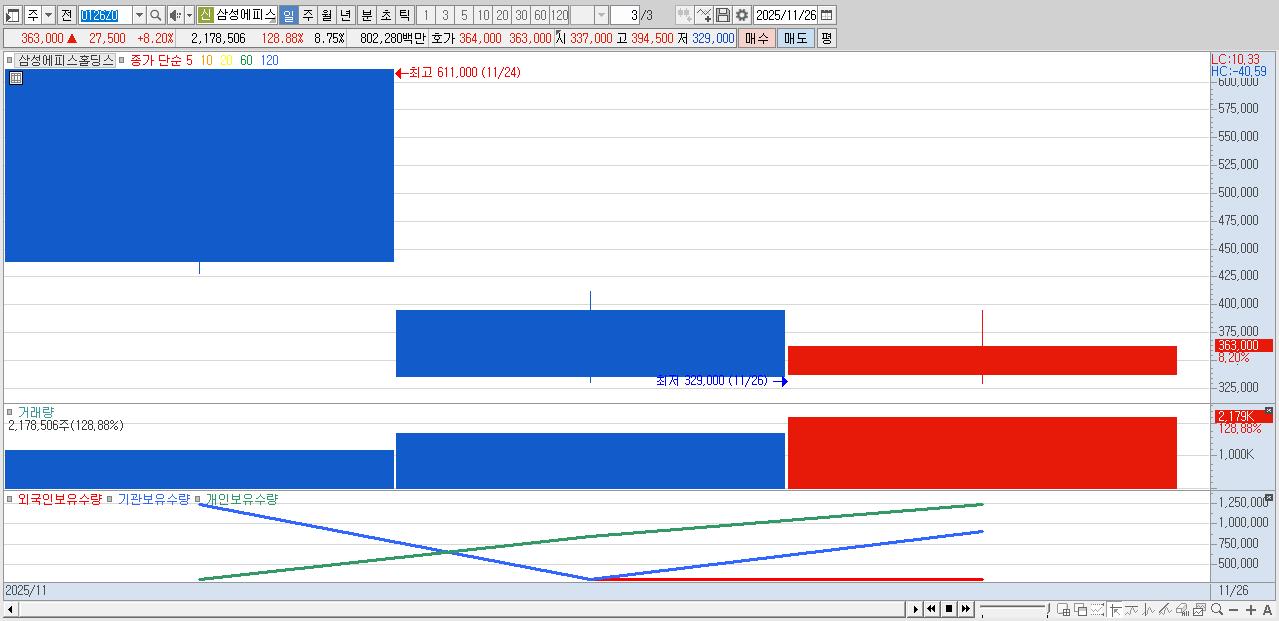 - 삼성에피스홀딩스 (363,000원 ▲ 8.2% , 시총: 90,325억, 거래량: 2,178,506, 거래대금:8,023억)
