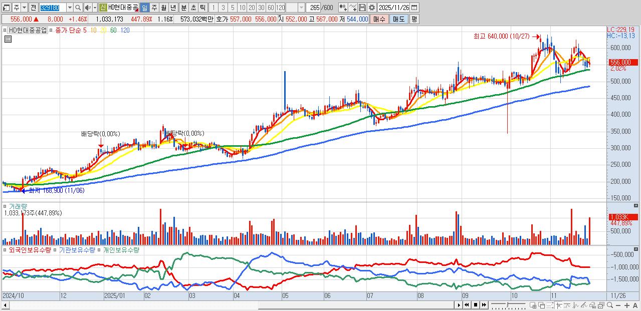 - HD현대중공업 (554,000원 ▲ 1.09% , 시총: 491,803억, 거래량: 984,466, 거래대금:5,460억)