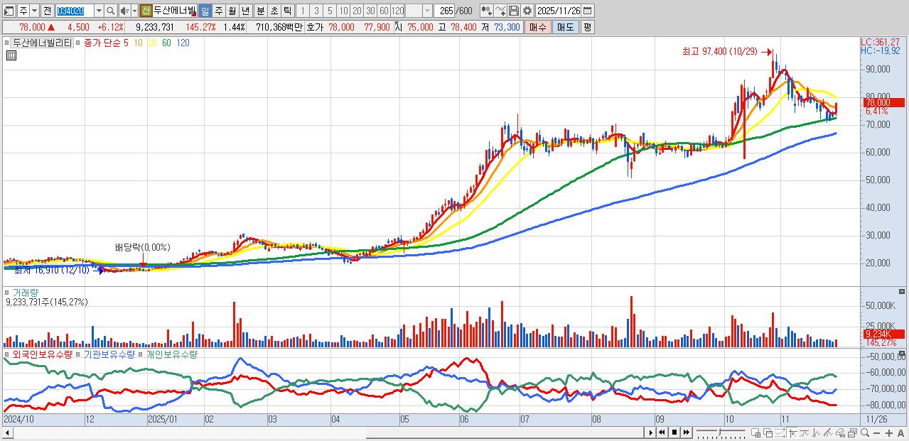 - 두산에너빌리티 (77,700원 ▲ 5.71% , 시총: 497,716억, 거래량: 4,463,298, 거래대금:3,442억)