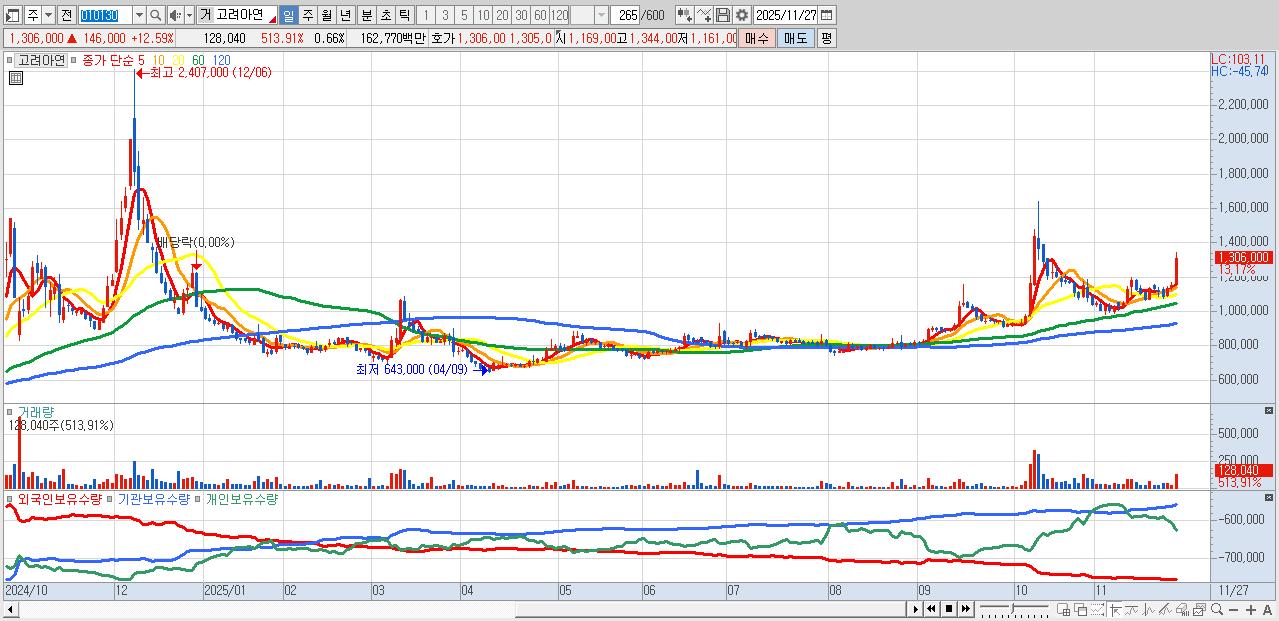- 고려아연 (1,325,000원 ▲ 14.22% , 시총: 256,298억, 거래량: 76,263, 거래대금:970억)