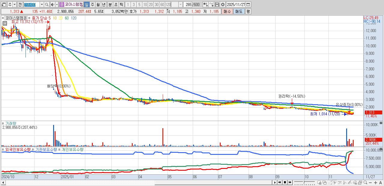 - 코아스템켐온 (1,313원 ▲ 11.46% , 시총: 694억, 거래량: 2,988,856, 거래대금:39억)