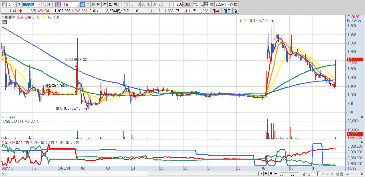 - 베셀 (1,411원 ▲ 29.93% , 시총: 277억, 거래량: 1,927,233, 거래대금:27억)
