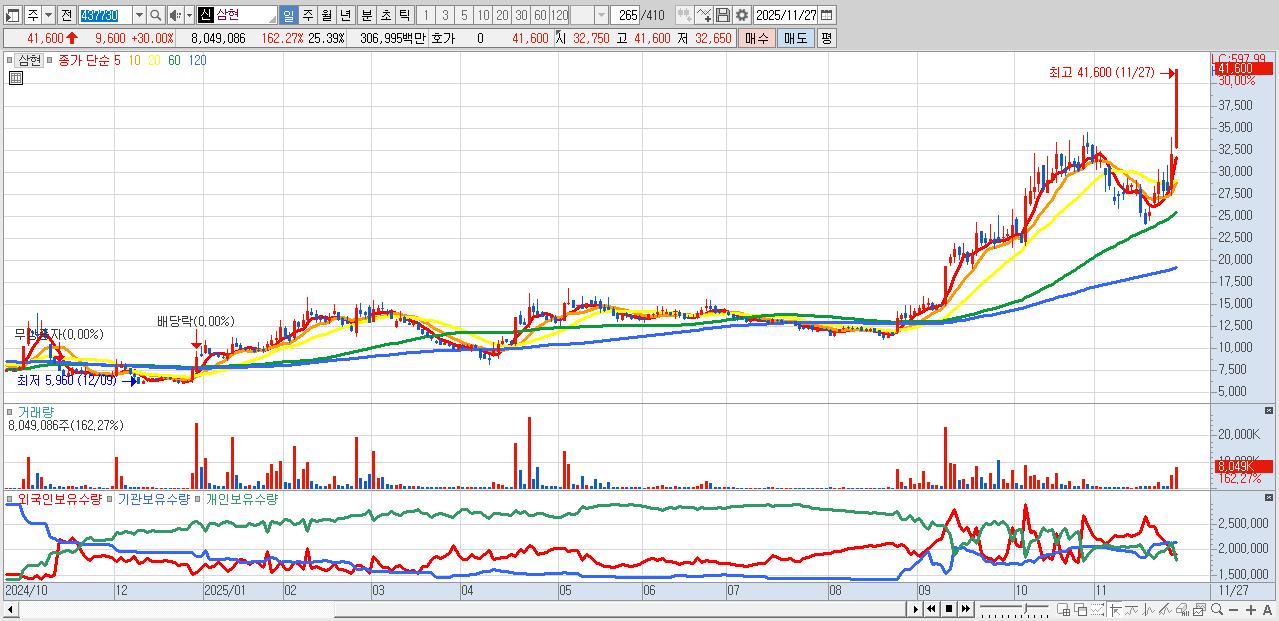- 삼현 (41,600원 ▲ 30% , 시총: 13,190억, 거래량: 8,049,086, 거래대금:3,070억)