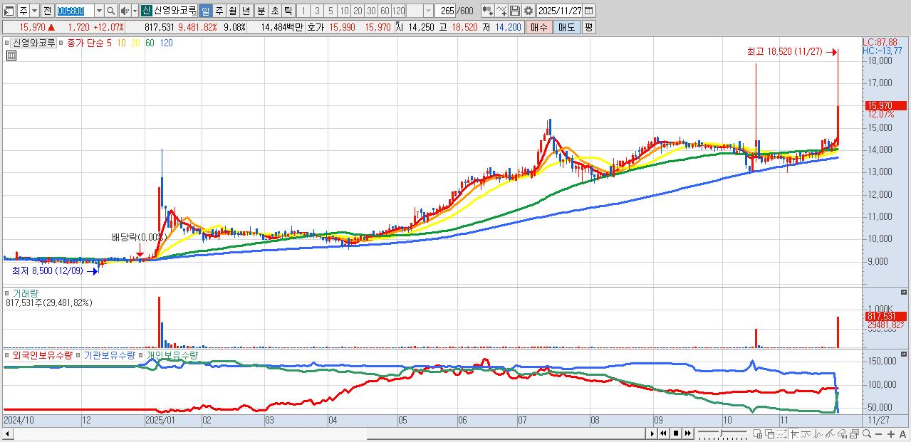 - 신영와코루 (15,970원 ▲ 12.07% , 시총: 1,437억, 거래량: 817,531, 거래대금:145억)