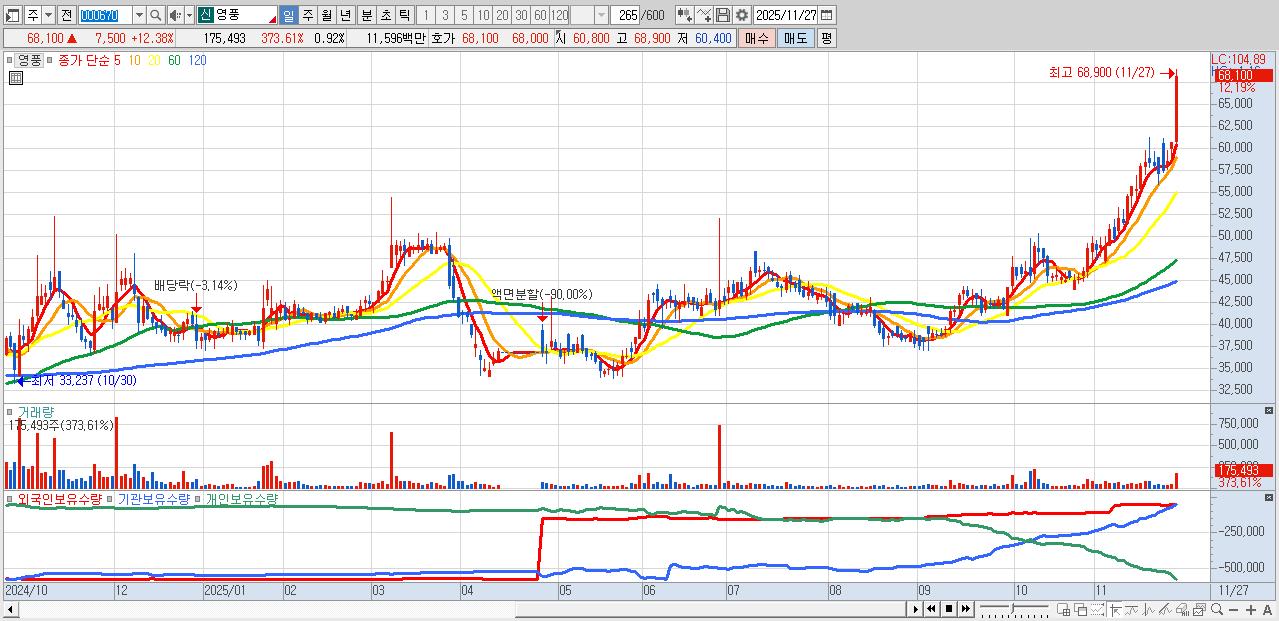 - 영풍 (68,100원 ▲ 12.38% , 시총: 13,013억, 거래량: 120,883, 거래대금:80억)
