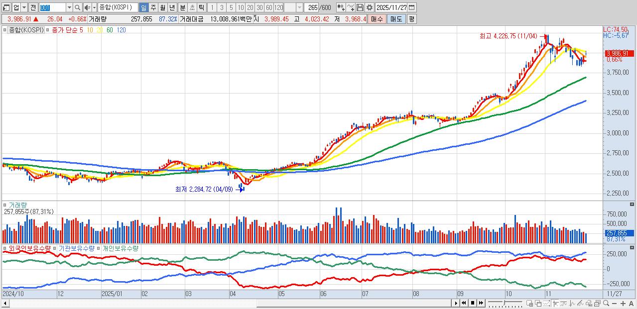 | 11/27 | 3,986.91 | ▲0.66% | -6,152억 | 1,546억 | 4,326억 | 281억 |