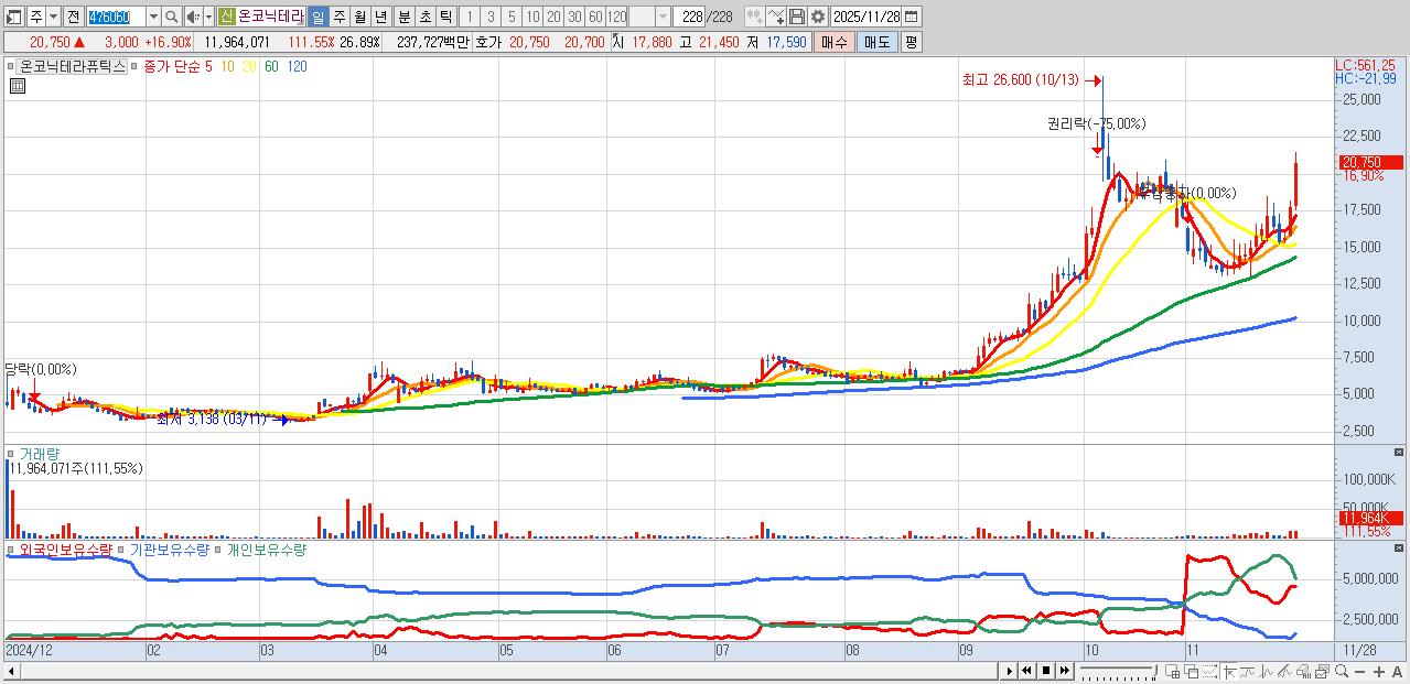 - 온코닉테라퓨틱스 (20,750원 ▲ 16.9% , 시총: 9,232억, 거래량: 11,964,071, 거래대금:2,377억)