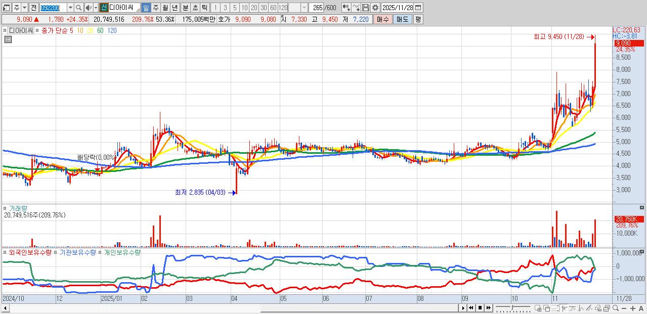 - 디아이씨 (9,090원 ▲ 24.35% , 시총: 3,535억, 거래량: 20,749,516, 거래대금:1,750억)