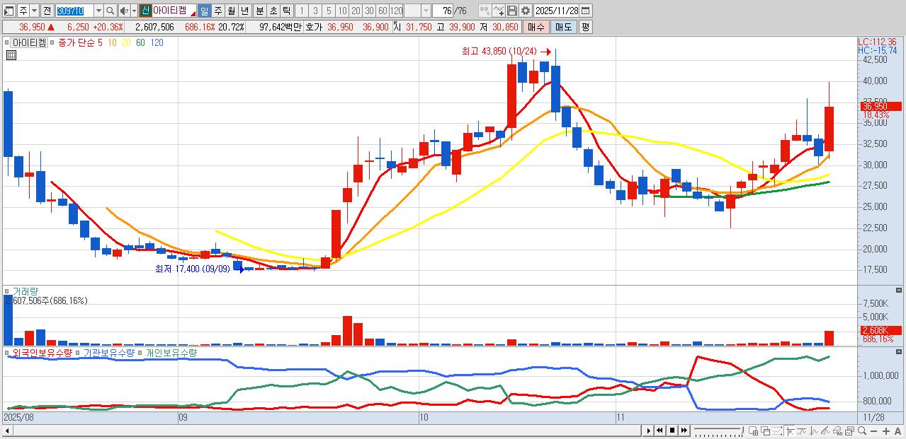 - 아이티켐 (36,350원 ▲ 18.4% , 시총: 4,574억, 거래량: 1,171,421, 거래대금:441억)