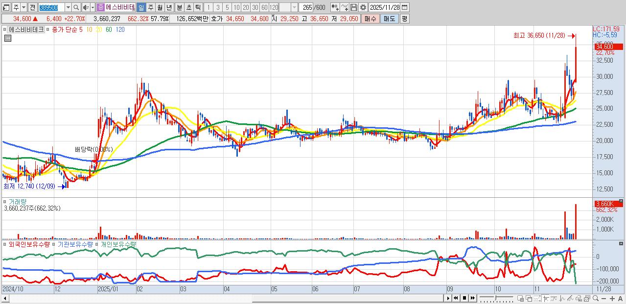 - 에스비비테크 (34,600원 ▲ 22.7% , 시총: 2,192억, 거래량: 3,660,237, 거래대금:1,267억)