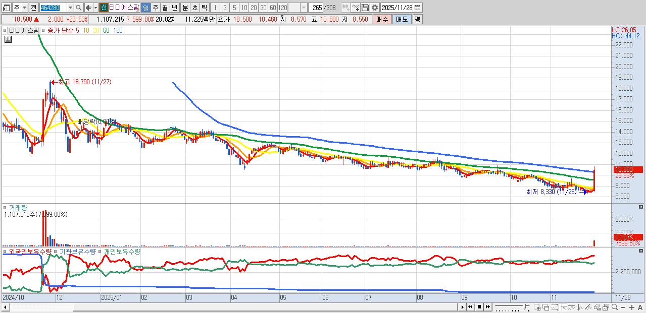 - 티디에스팜 (10,500원 ▲ 23.53% , 시총: 581억, 거래량: 1,107,215, 거래대금:112억)
