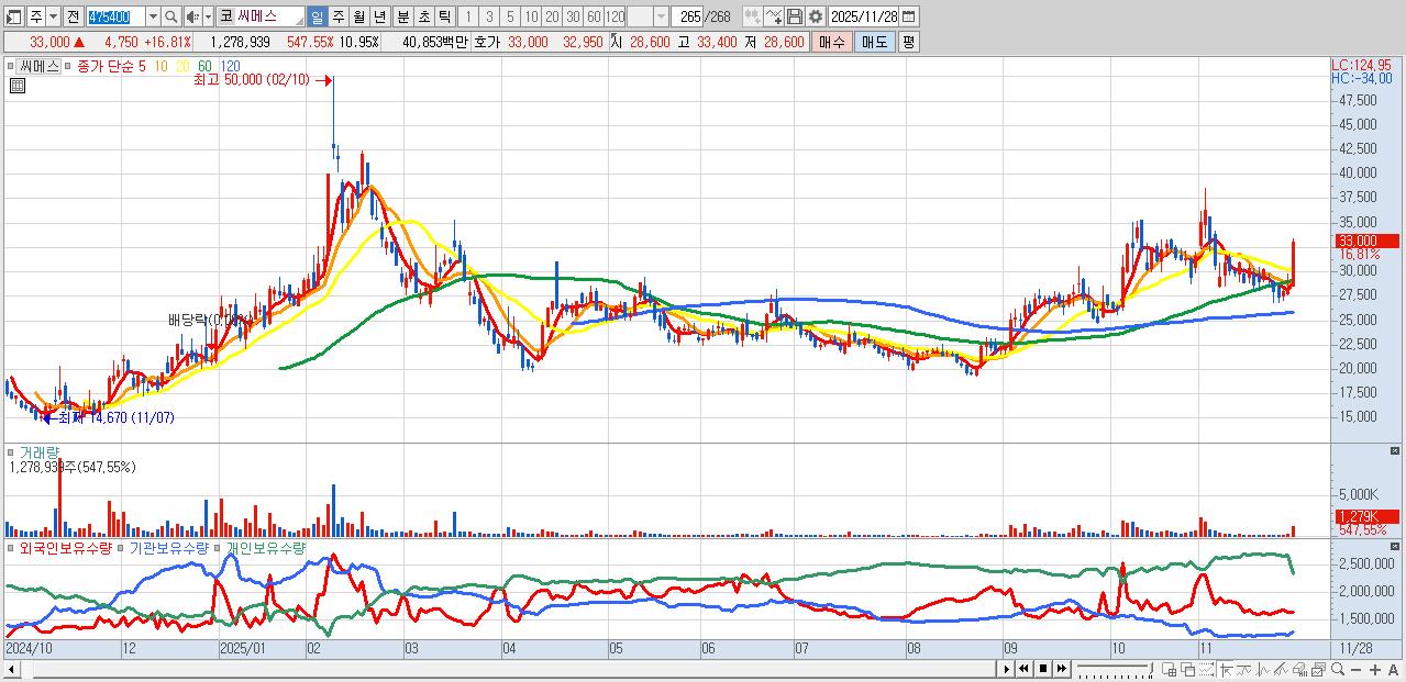 - 씨메스 (33,000원 ▲ 16.81% , 시총: 3,856억, 거래량: 1,278,939, 거래대금:409억)