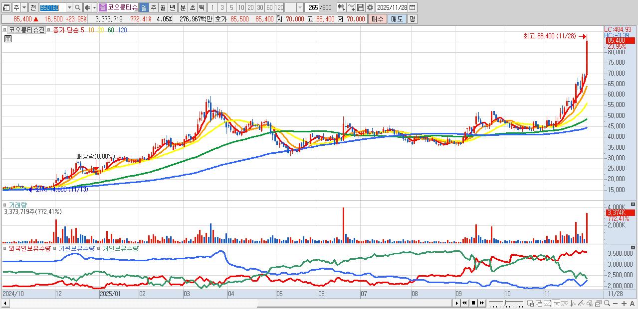- 코오롱티슈진 (85,400원 ▲ 23.95% , 시총: 71,071억, 거래량: 3,373,719, 거래대금:2,770억)