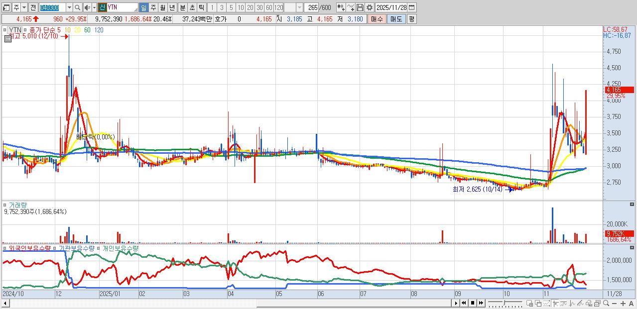 - YTN (4,165원 ▲ 29.95% , 시총: 1,986억, 거래량: 9,752,390, 거래대금:372억)