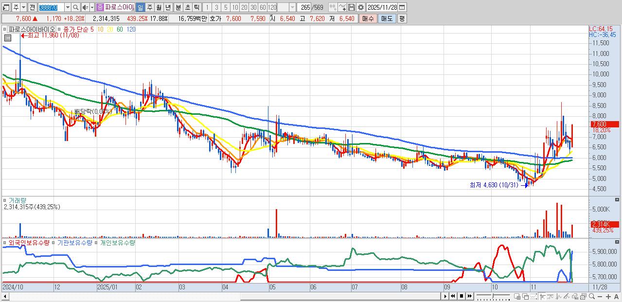 - 파로스아이바이오 (7,600원 ▲ 18.2% , 시총: 984억, 거래량: 2,314,315, 거래대금:168억)