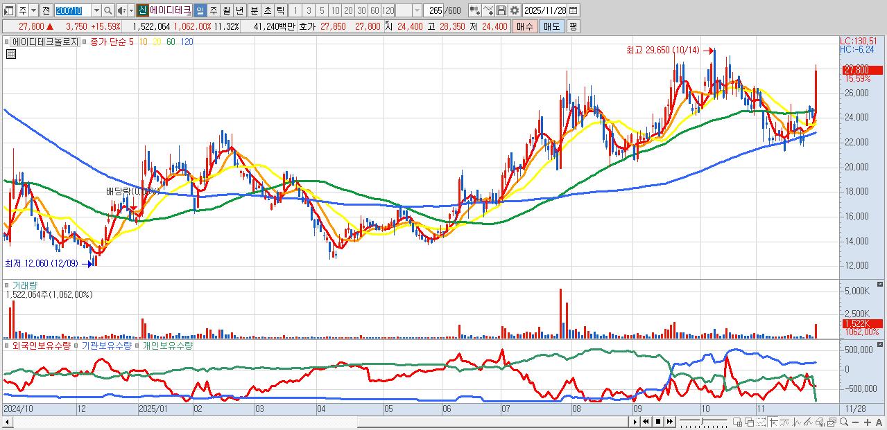 - 에이디테크놀로지 (27,800원 ▲ 15.59% , 시총: 3,737억, 거래량: 1,522,064, 거래대금:412억)
