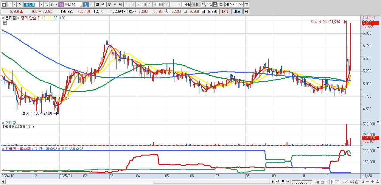 - 옵티팜 (6,200원 ▲ 17.65% , 시총: 910억, 거래량: 176,993, 거래대금:10억)