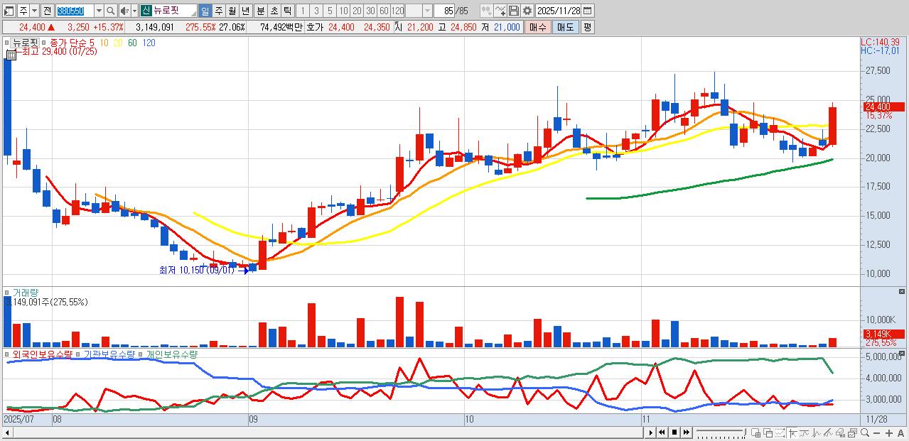 - 뉴로핏 (24,400원 ▲ 15.37% , 시총: 2,839억, 거래량: 3,149,091, 거래대금:745억)