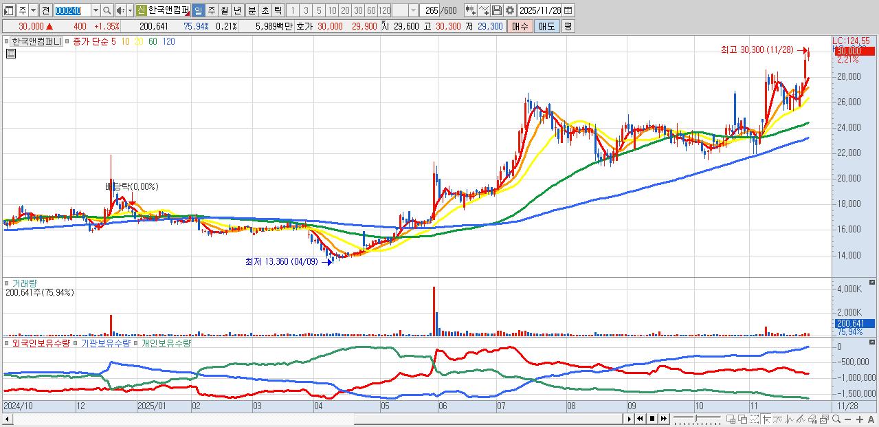- 한국앤컴퍼니 (29,850원 ▲ 0.84% , 시총: 28,338억, 거래량: 157,836, 거래대금:47억, KOSPI)