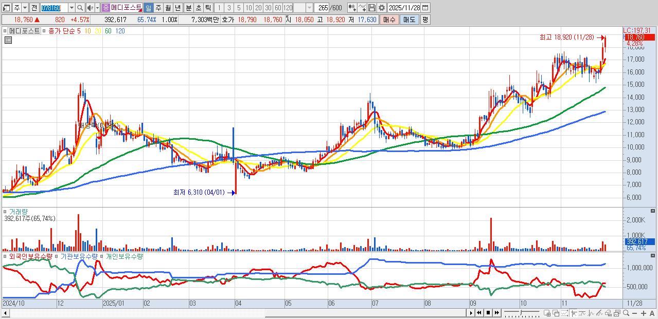 - 메디포스트 (18,750원 ▲ 4.52% , 시총: 7,351억, 거래량: 221,914, 거래대금:41억, KOSDAQ)