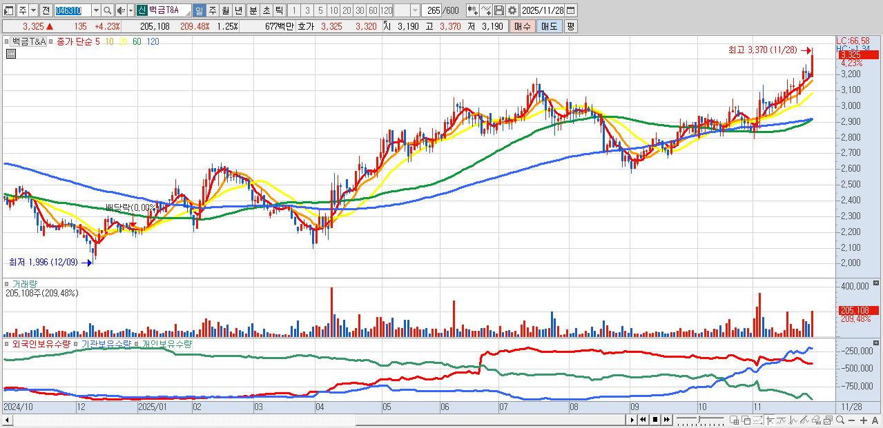 - 백금T&A (3,325원 ▲ 4.23% , 시총: 546억, 거래량: 205,108, 거래대금:7억, KOSDAQ)