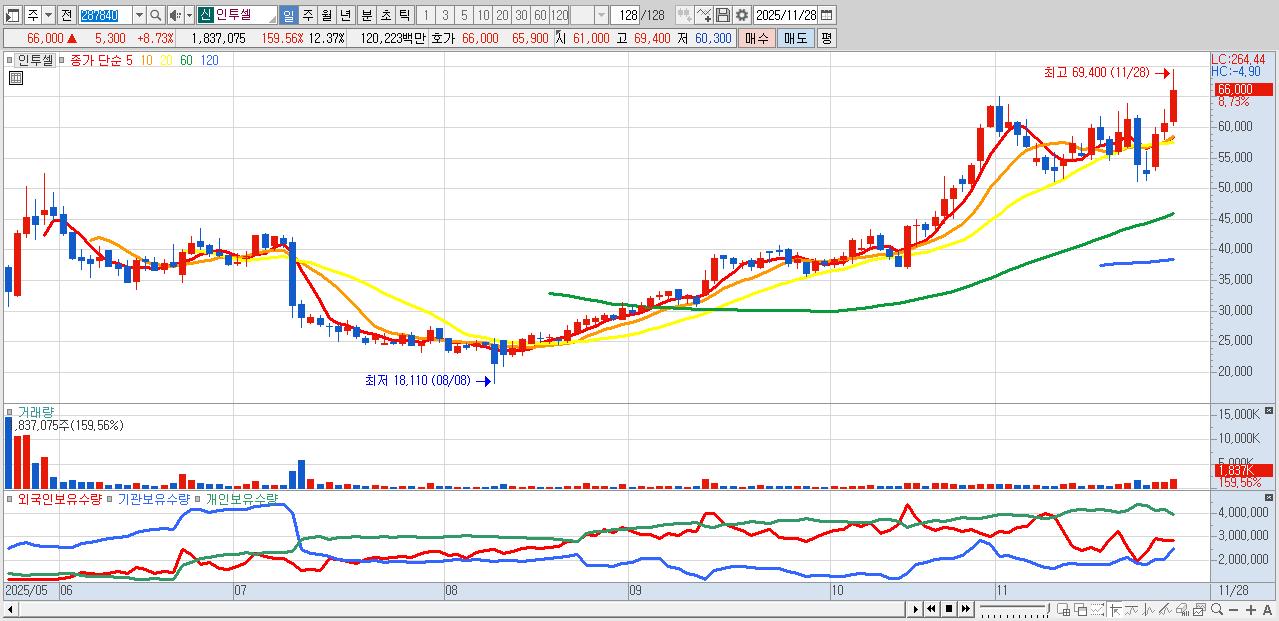 - 인투셀 (66,000원 ▲ 8.73% , 시총: 9,799억, 거래량: 1,837,075, 거래대금:1,202억, KOSDAQ)