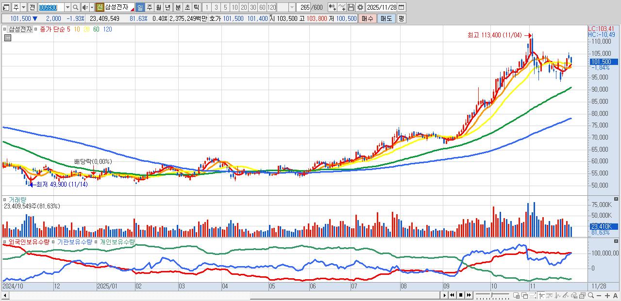 1.삼성전자 100,500원 ▼ -2.9% (KOSPI, 005930)