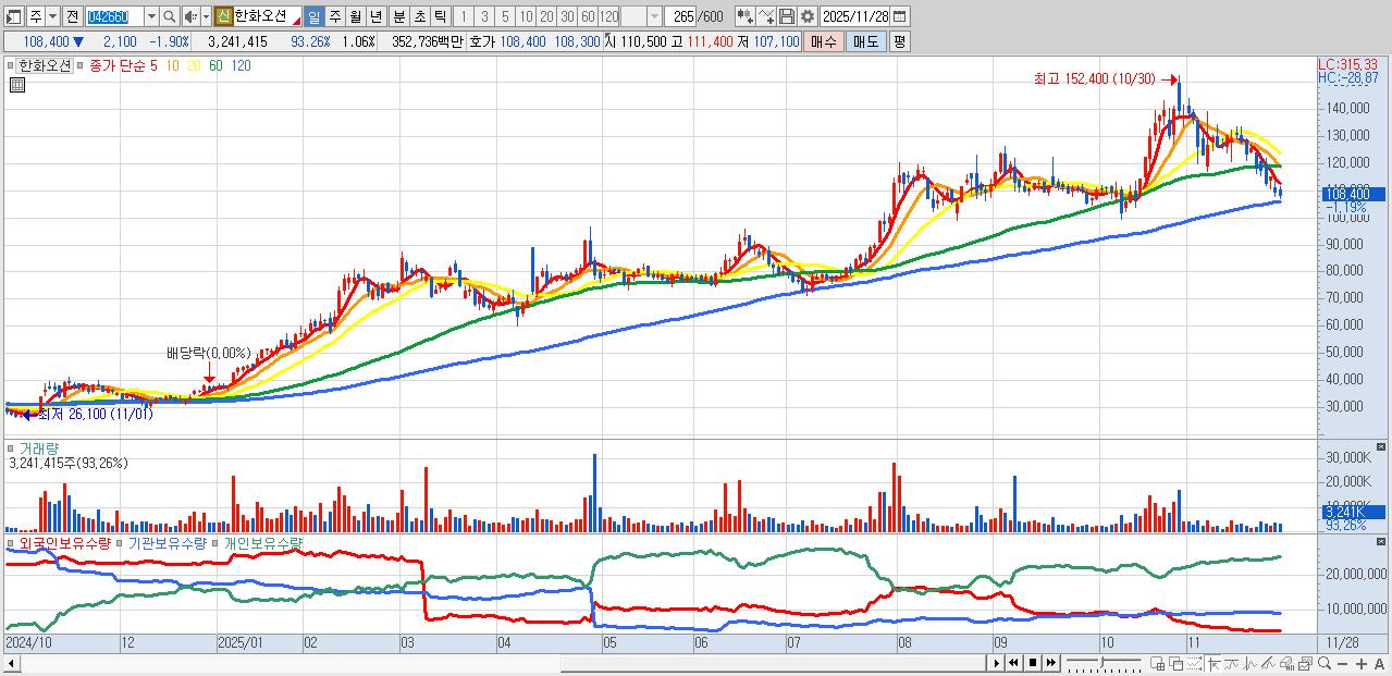 - 한화오션 (107,800원 ▼ -2.44% , 시총: 330,314억, 거래량: 1,800,329, 거래대금:1,959억)